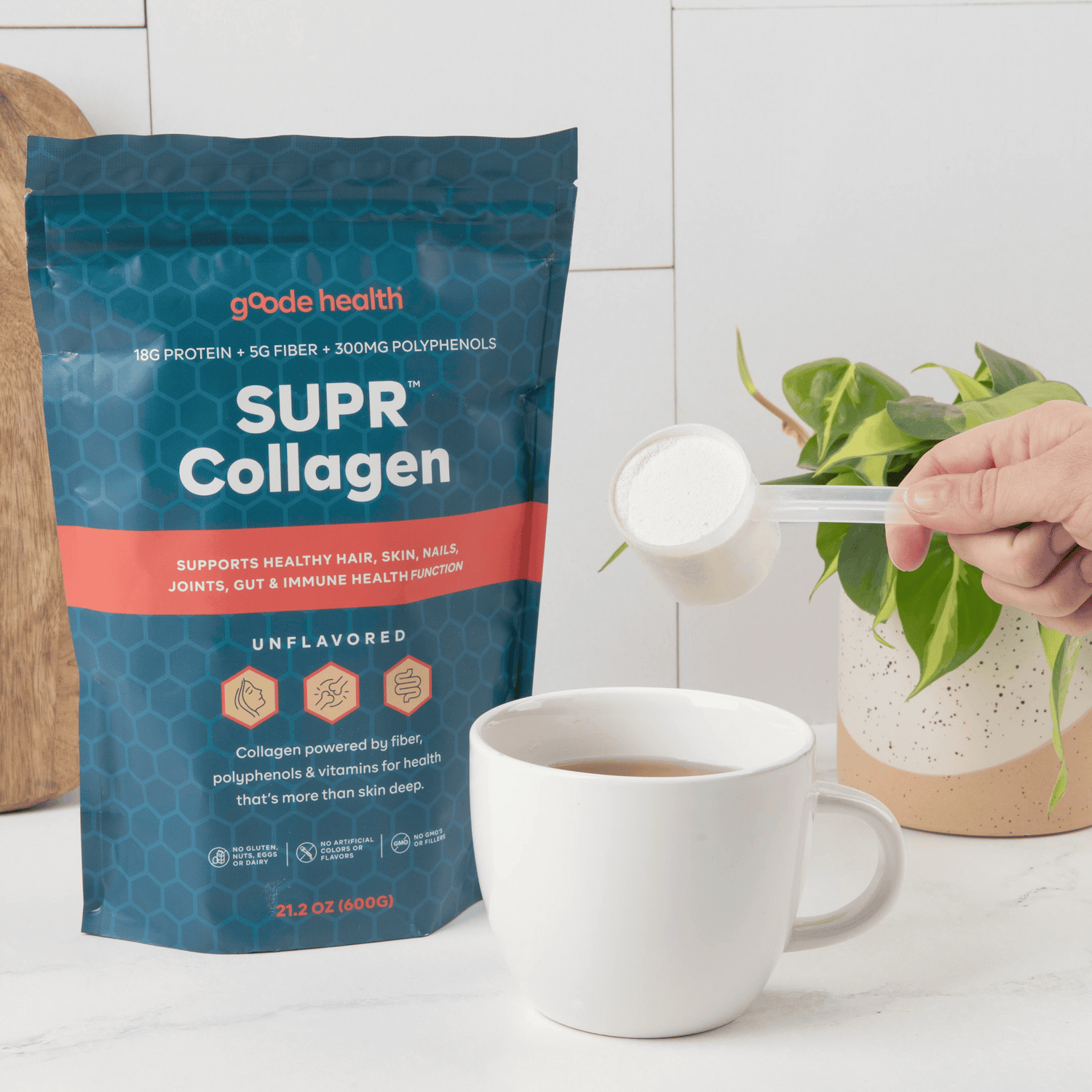 Most collagen supports structure. SUPR Collagen supports protection, too. It’s the only collagen powder with polyphenols + fiber + vitamins for complete beauty, gut, and antioxidant support in one scoop.
